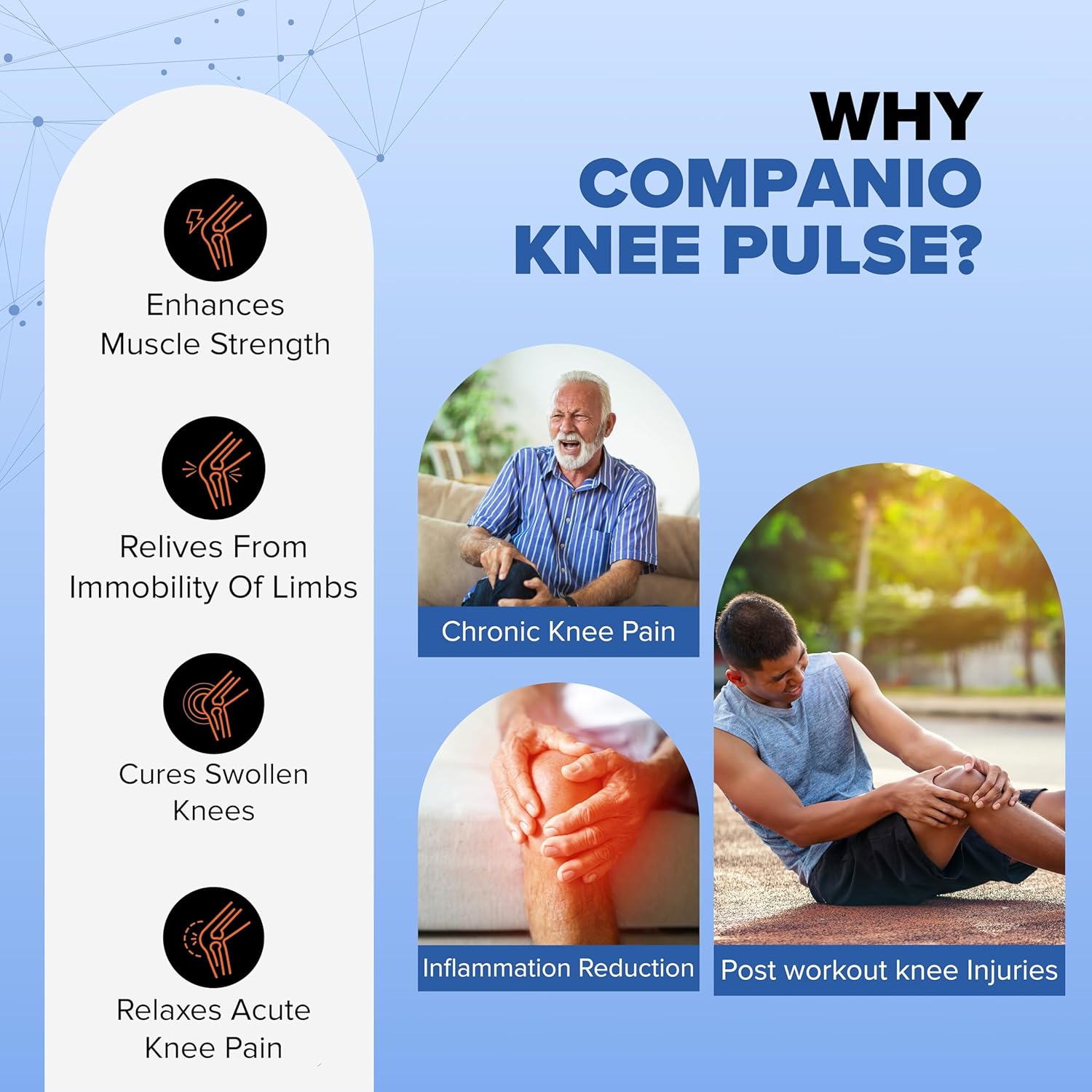 COMPANIO Cordless Knee Massager with TENS for Men & Women – 30 Adjustable Intensity Levels, 3 Modes – Relief from Knee Pain, Joint Pain, Swelling & Arthritis – Rechargeable, Portable – Muscle/Nerve Stimulator with Electrode Gel – No Side Effects – Physiotherapy, Massage & Cramps Therapy – doctor‑friendly, reliable healthcare product designed for safe daily home use.