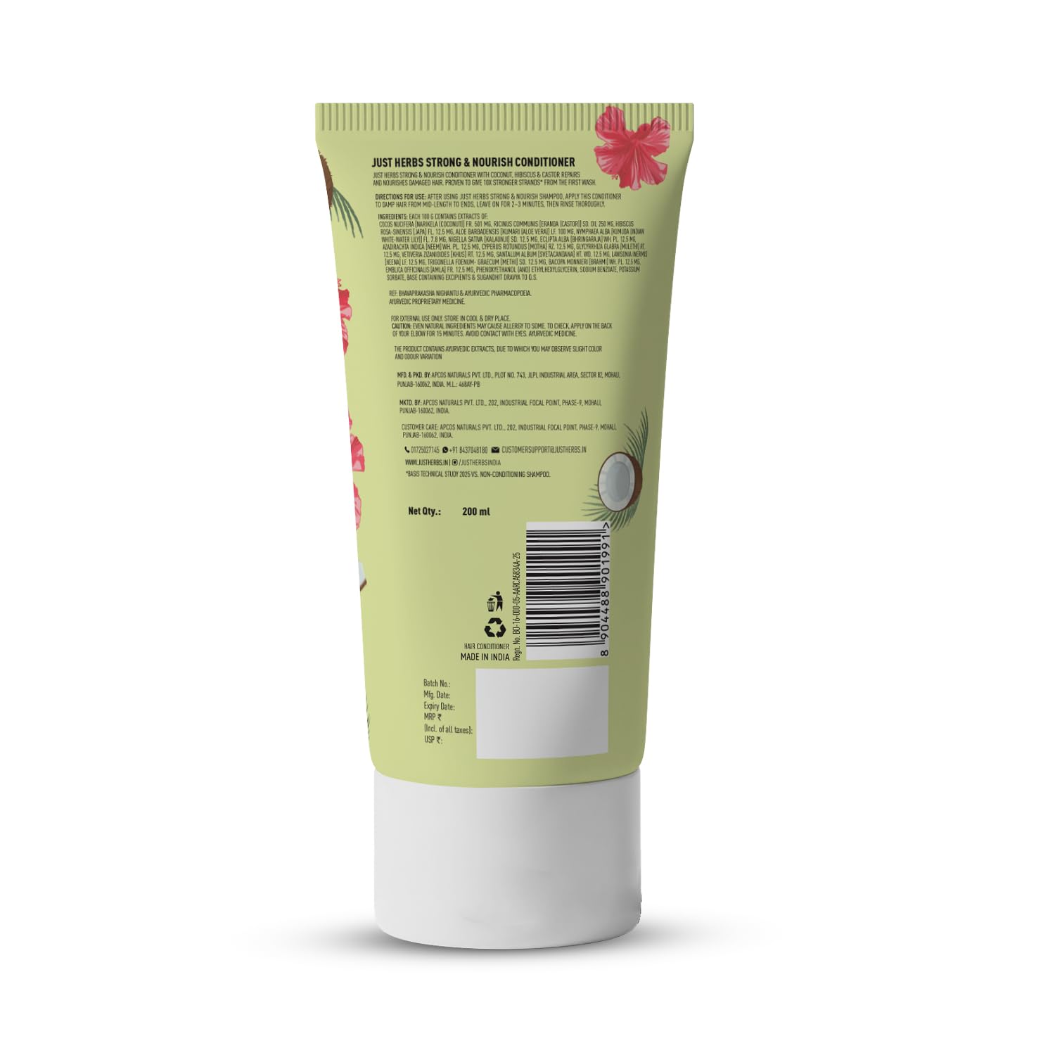 Just Herbs Strong & Nourish Conditioner | Coconut, Hibiscus, Castor & 13 Herbs | 10X Stronger Hair | Controls Frizz | Ayurvedic Conditioner for All Hair Types – 200ml