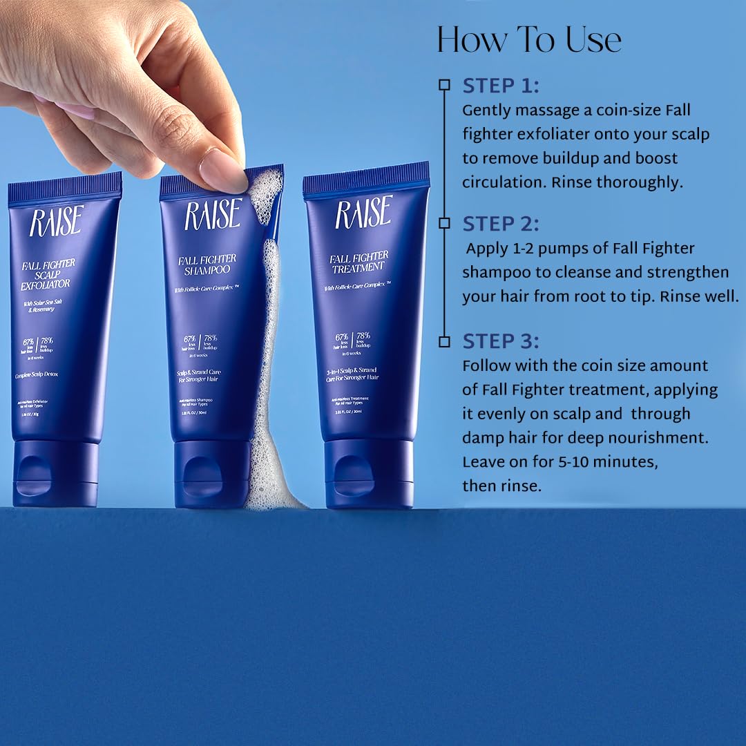 Raise Fall Fighter Anti-Hairfall Travel Kit | 3-step hair care routine | 67% Less Hair Loss in 6 Weeks | Infused with Rosemary | SLS & Paraben Free | Exfoliate, Cleanse & Condition| 30ml Each
